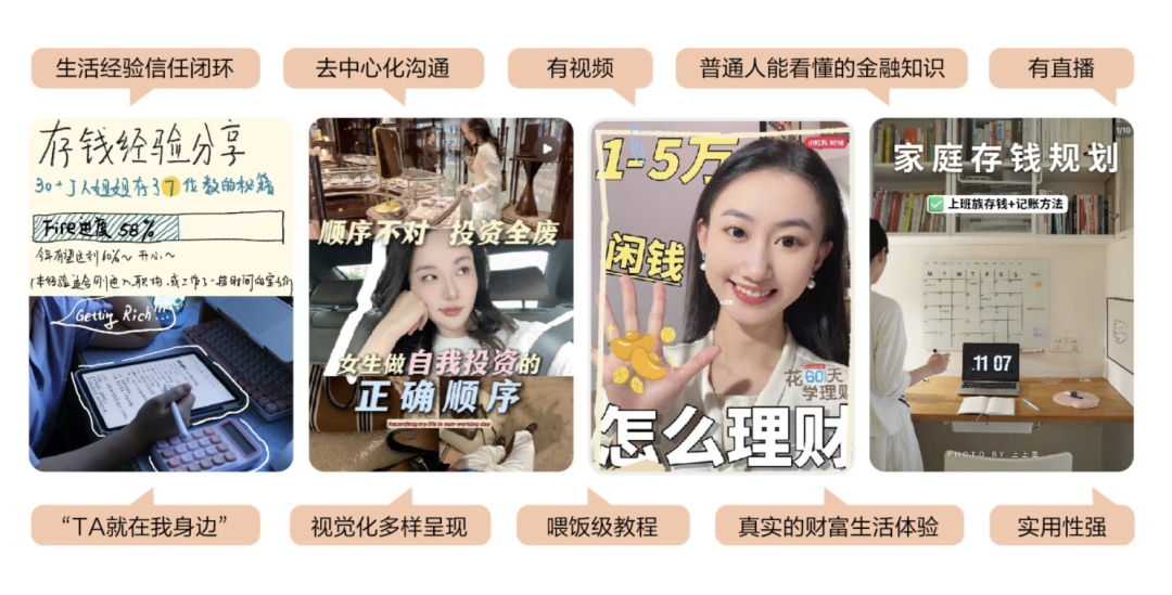 这种金融信任并不只来源于金融机构与产品本身的专业供给,也越来越建立在真实生活经验、具体场景体验以及社区互动之上。金融财富不再只是冰冷的专业术语或账面数字,而是在用户的生活分享与交流中,逐渐被转化为可以触摸、可以理解的生活愿景。在小红书,金融信任因此与“生活化”紧密连接,这也成为平台吸引金融财富人群的重要差异化价值。